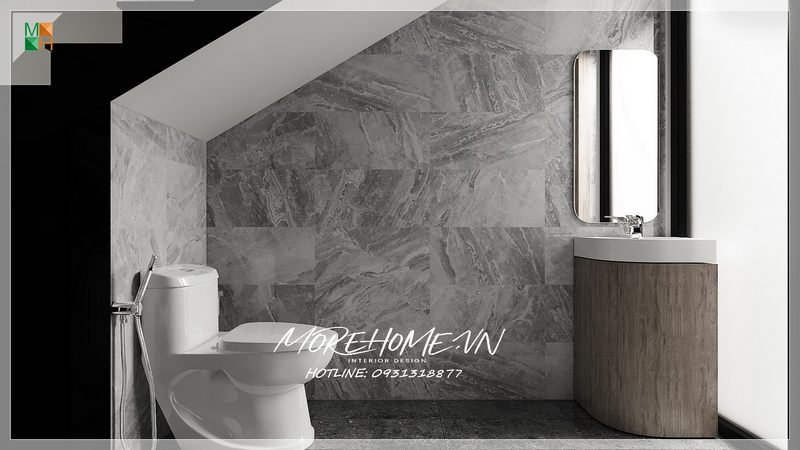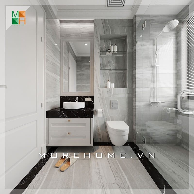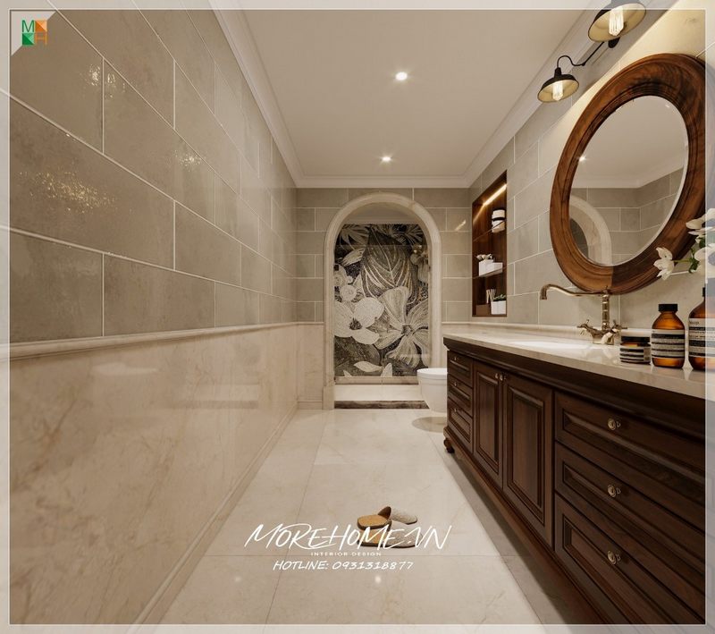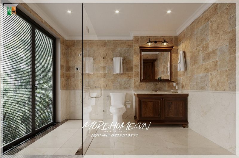 Kệ tủ bằng gỗ màu nâu trầm hiện đại cất trữ đồ đạc giúp cho không gian phòng tắm gọn gàng ngăn nắp thuận tiện cho quá trình sinh hoạt.