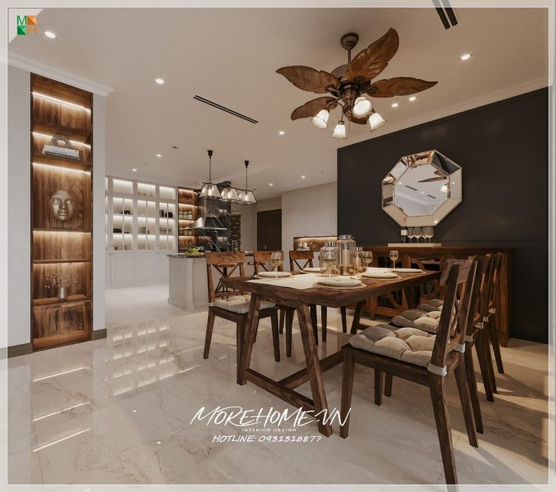 Nội thất bên trong căn nhà cũng được chú trọng từ chiếc gương lục giác dán tường độc lạ tới chiếc quạt trần hình lá kết hợp cả đèn trần làm nên điểm nhấn đặc sắc cho phòng ăn chung cư