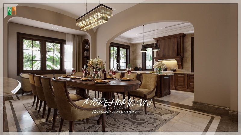 Thiết kế phòng ăn sang trọng ấm cúng với nội thất gỗ óc chó cao cấp