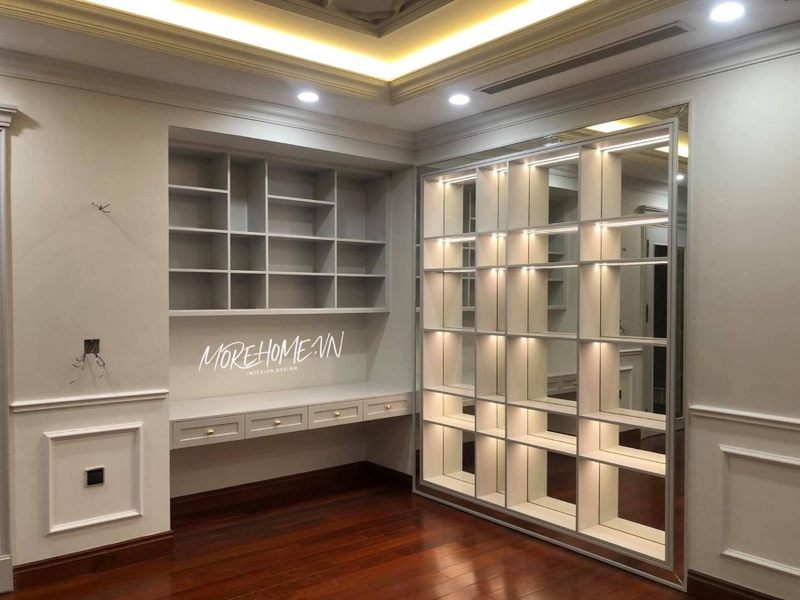 Sản phẩm bàn làm việc treo tường kèm giá sách bằng gỗ tự nhiên sơn trắng cho phòng khách được sản xuất tại Morehome