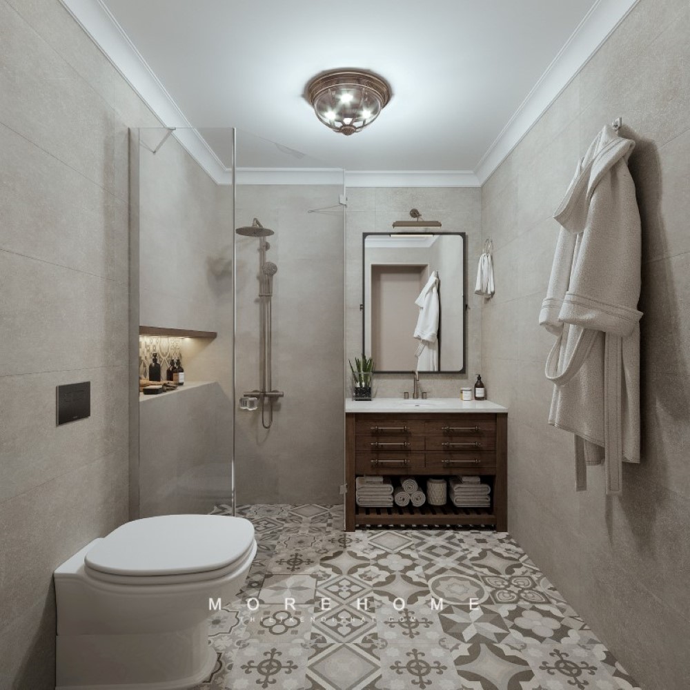Mẫu thiết kế phòng vệ sinh đẹp nổi bật với hai gam màu trắng và xanh rêu.