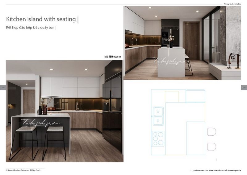 Thiết kế tủ bếp gỗ công nghiệp kịch trần giúp tận dụng không gian để đồ phía trên, rất phù hợp với không gian nhà phố, chung cư nhỏ